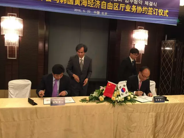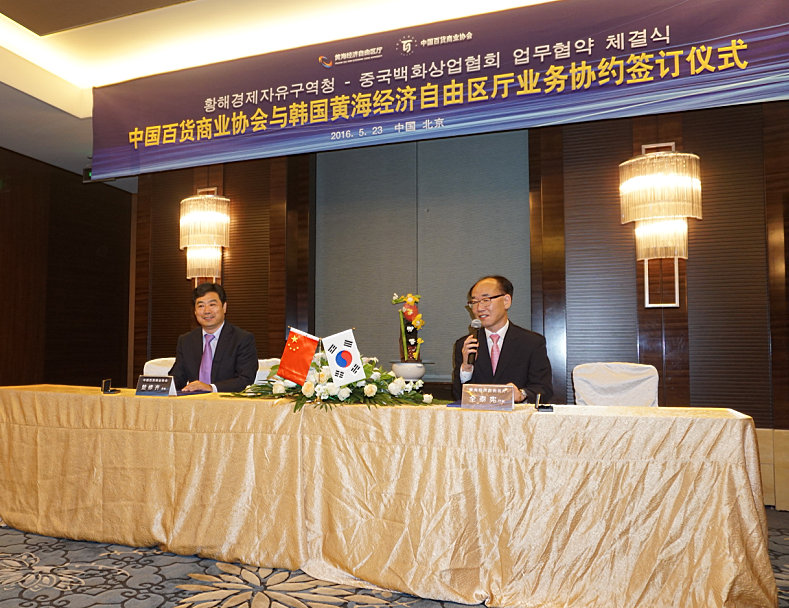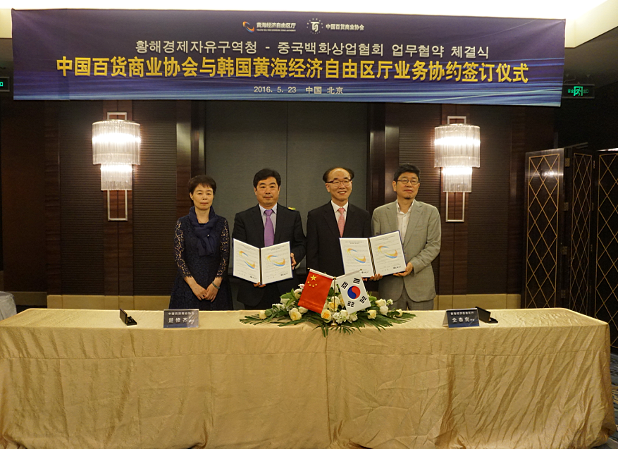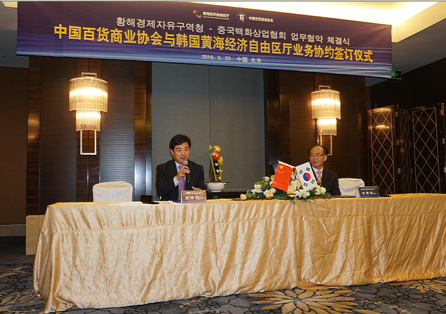 5月23日,中國百貨商業協會與韓國黃海經濟自由區廳在北京簽訂戰略合作協議,雙方將共同推動中國流通企業到韓國黃海經濟自由區廳投資發展。中國百貨商業協會會長楚修齊、韓國黃海經濟自由區廳長全泰憲分別簽署協議。