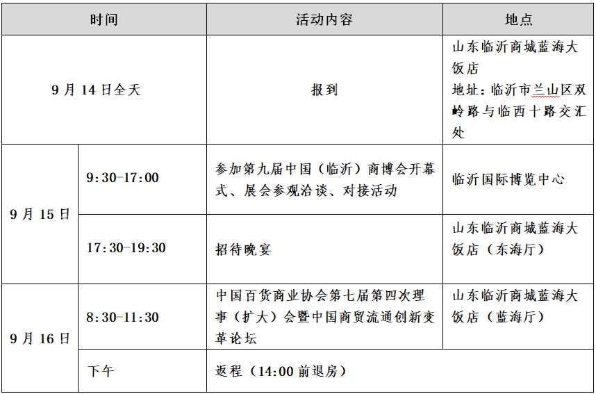 中國百貨商業協會定于2018年9月14日在山東臨沂市召開中國百貨商業協會第七屆第四次理事(擴大)會暨中國商貿流通創新變革論壇。此次會議主要針對當前商貿流通企業面對新消費時代的到來,重點在流通變革、業態創新,智慧商務等方面進行探討交流,同時,組織參觀第九屆中國(臨沂)商博會,為零售企業開展直采自營業務,加大商品源頭采購,豐富特色產品,拓展渠道,提供資源。