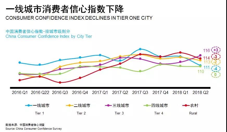 2018年第一季度數據來看,相比一線城市,三四線及農村市場消費信心明顯強于一線城市,特別是三線城市,連續三個季度呈現增強趨勢。