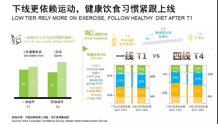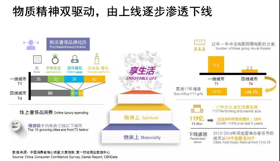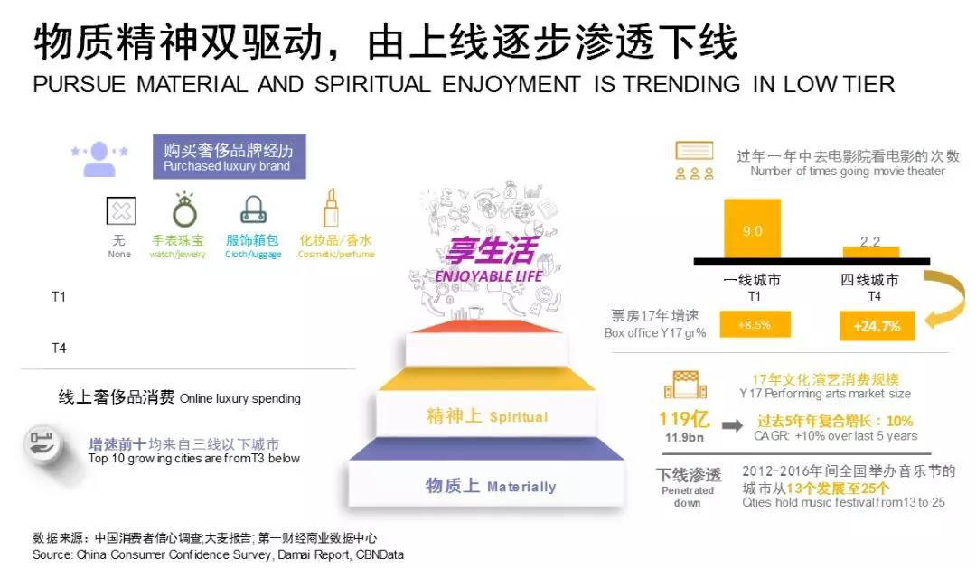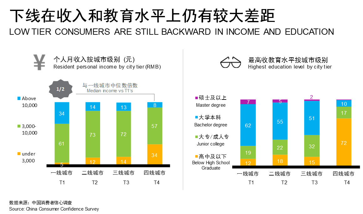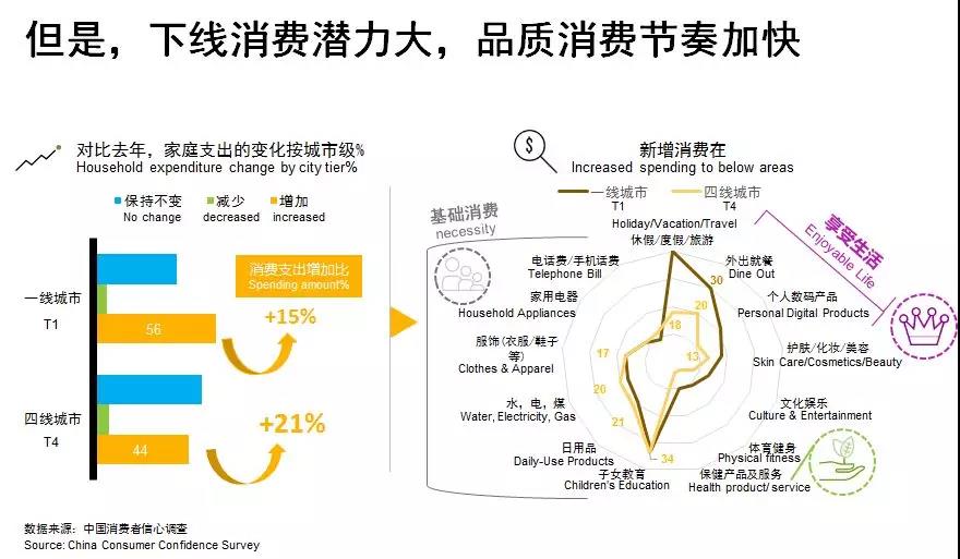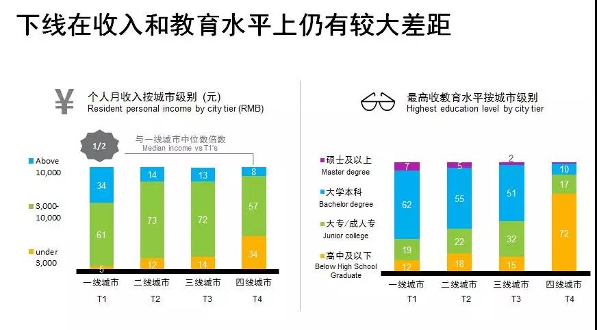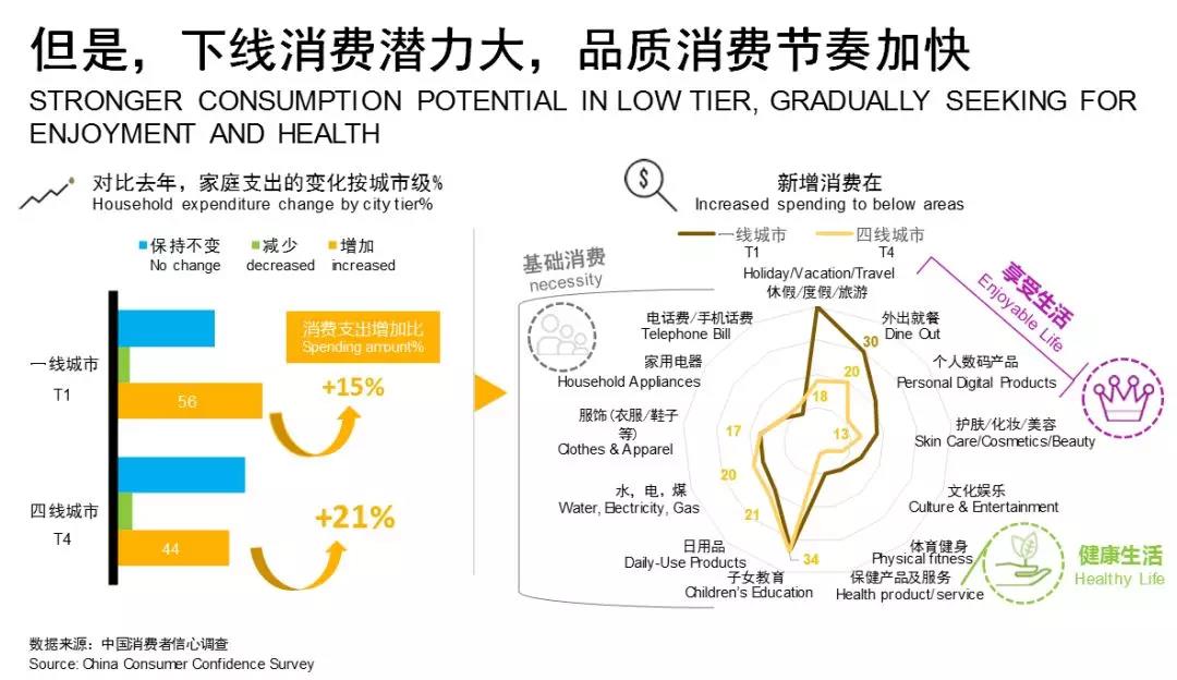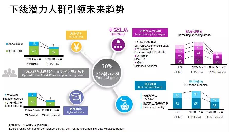 三四線城市消費者在收入和教育水平上和一線存在差距,但在消費上呈現高潛力,一線城市消費者則呈現消費回歸理性的傾向,三四線在享受與健康生活緊追一線,得益于三四線城市的超級消費者去感染帶動周邊的非潛力人群,推動下線整體。