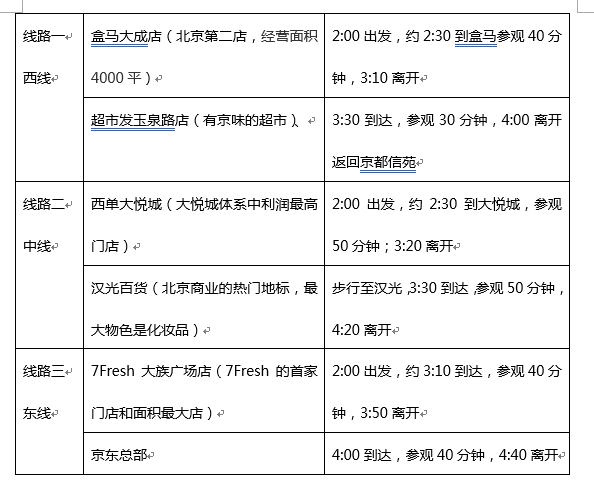 東線7Fresh大族廣場店和京東總部。7Fresh大族廣場店是7Fresh的首家門店和面積最大店,店內整合自助收銀、刷臉支付、精選商品、原產地選品、食品可追溯、人臉識別、智能補貨、大數據、線上下單半小時達、店內餐區加工、智能購物車等技術。在京東總部將參觀京東之家、京東視界、X無人超市。
