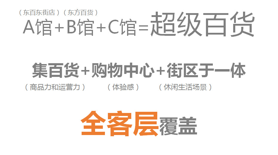 A館把它定位成一個精品百貨跟購物中心的結合體,如果大家去看過東百中心就能看得出來,A館不是一個百貨結構,我們改造完了以后更像一個購物中心的結構,但是內容是承接了精品百貨跟購物中心的結合體。我們的B館是一個物理條件非常差的百貨,就是一條巷子,單層面積非常小,單通道,所以物業結構已經固定化,沒有辦法來改造,所以這個B館還是定位成一個高線精品百貨。然后A館和B館有一個連廊,C館通過地下的地鐵物業連為一體。