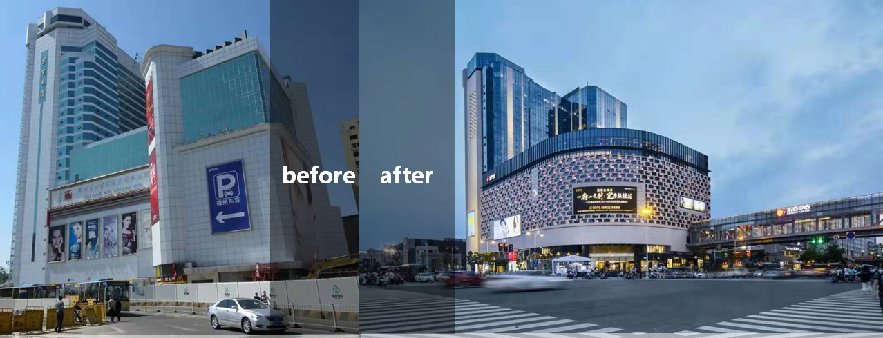 這個是兩個對比,這個是老的東百百貨,這個是2017年的圖片,改造之前,那張圖是現在的圖片,我們改造之后的圖片。以前的百貨公司作進去,在2017年之前走進去,估計你們能看到中國最老最傳統的百貨,但是今天我相信走進東百中心,它是有點現代化的時尚。