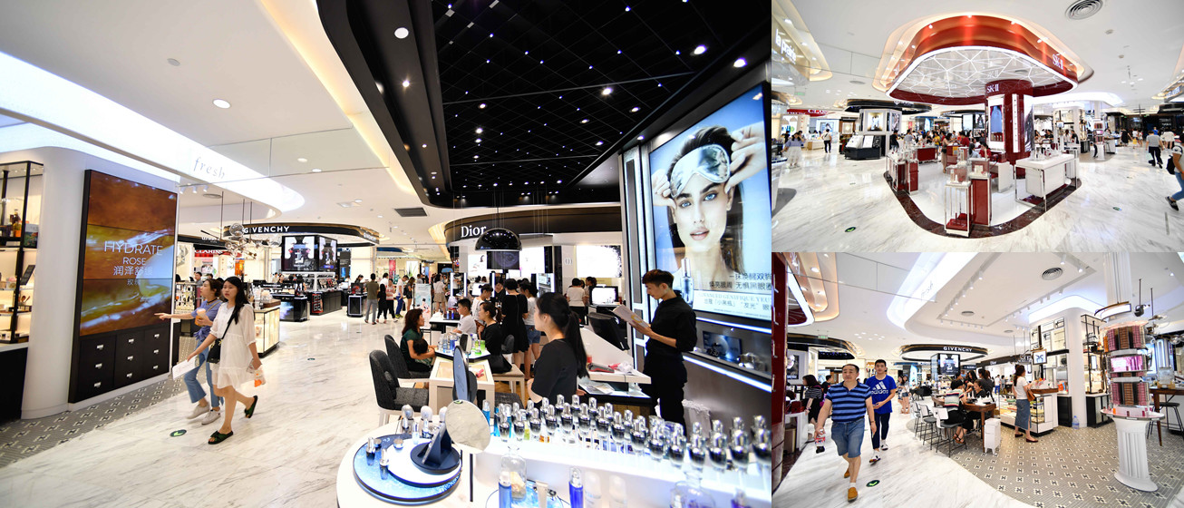 這個是我們的化妝品,應該從整體形象跟品牌的組合還行過得去,因為我們的時間只花了幾個月,所以還有很多地方做的不完善,但是整體的時尚感跟品牌的組合,給到顧客的體驗還是不錯的,因為改造完以后的物業空間還不錯。這個是把門店關了,從點到地,重新做優化跟設計。