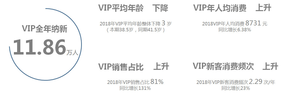 2018年東百中心有些核心數據沒有保留,我覺得這個行業都是通的,數據都是拿來分享的,我們全年的VIP的納新11.86萬,我們VIP的年齡下降了三歲,其實這個年齡是因為我們這個店里老顧客的比例非常大,所以下降三對于一個百貨第一年的改造來說,還是不容易,但是我們這個下降三歲里面,這11.86萬里面,我們有70%、80%以上的85后、90后,我們2018年VIP忍俊消費8731,同比增長比例不是很大。2018年VIP新客消費頻次2.29次,其實不是很高的一個值。說明一個問題,我們的新客年齡跟忠誠度還不高,這需要我們在未來經營里面要做的事情。這是我們整個VIP從年齡結構到消費能力,以及消費頻次的基本訴求。
