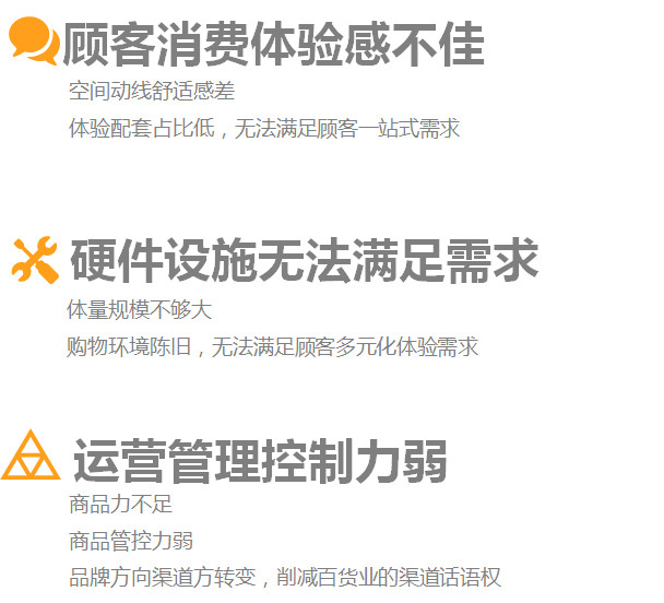 顧客消費體驗不佳,按我們的話說顧客不喜歡,顧客不喜歡到傳統百貨中來,因為空間有限,硬件老化,動線固化,除了商品還是商品,最關鍵商品五年、十年都沒有什么大的變化。重點講一下第三個,運營管控的控制力弱,這是我們做百貨明顯感覺的,我們商品力不足,可能五年傳統百貨商品更換率不超過20%,所以顧客看到永遠是老面孔,沒有創新,沒有新意,我們的商品管控能力也是偏,因為我們的忙是太偏弱。品牌方向渠道方轉變,削減百貨業的渠道話語權,以前我們非常牛的百貨公司,應該說在倒回去五年八年以前,一年365天總經理想吃飯天天有人請他吃飯,因為需求量太大。到今天這個趨勢在改變,因為我們渠道品牌選擇空間越來越大,不再依托傳統百貨做支撐點。