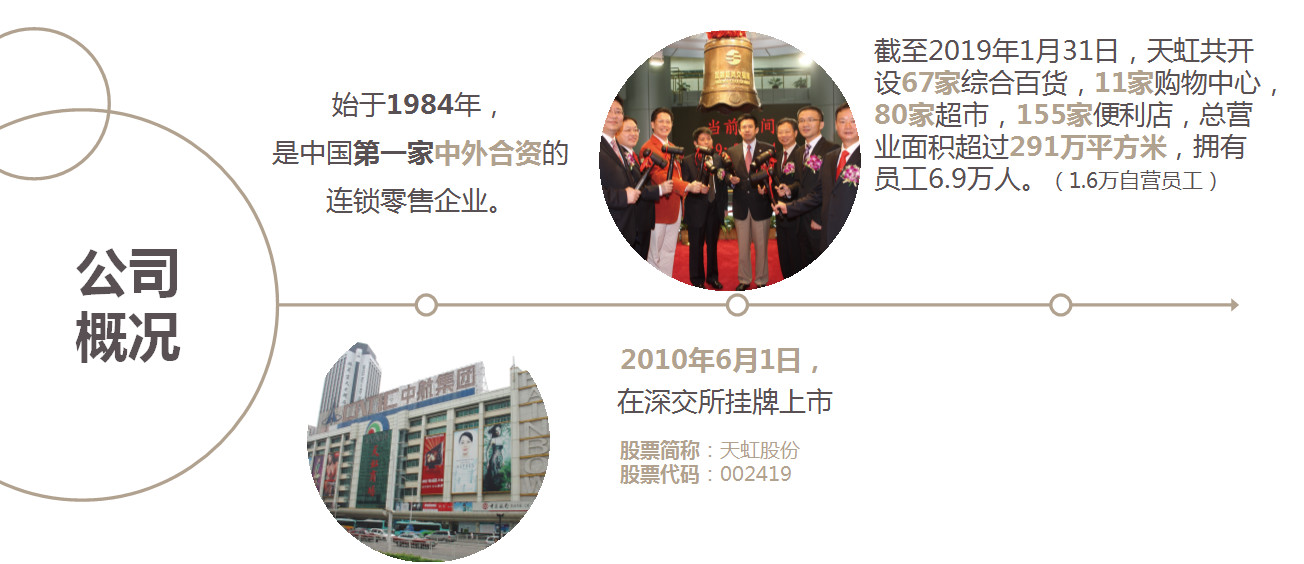 我先來簡單的介紹一下我們天虹基本情況,我們天虹是1984年成立的,現在有30多年的歷史,我們是2015年在新交所上市了,我們的業態是有綜合的百貨購物中心、便利店、超市,我們是一個多元化零售的業態。