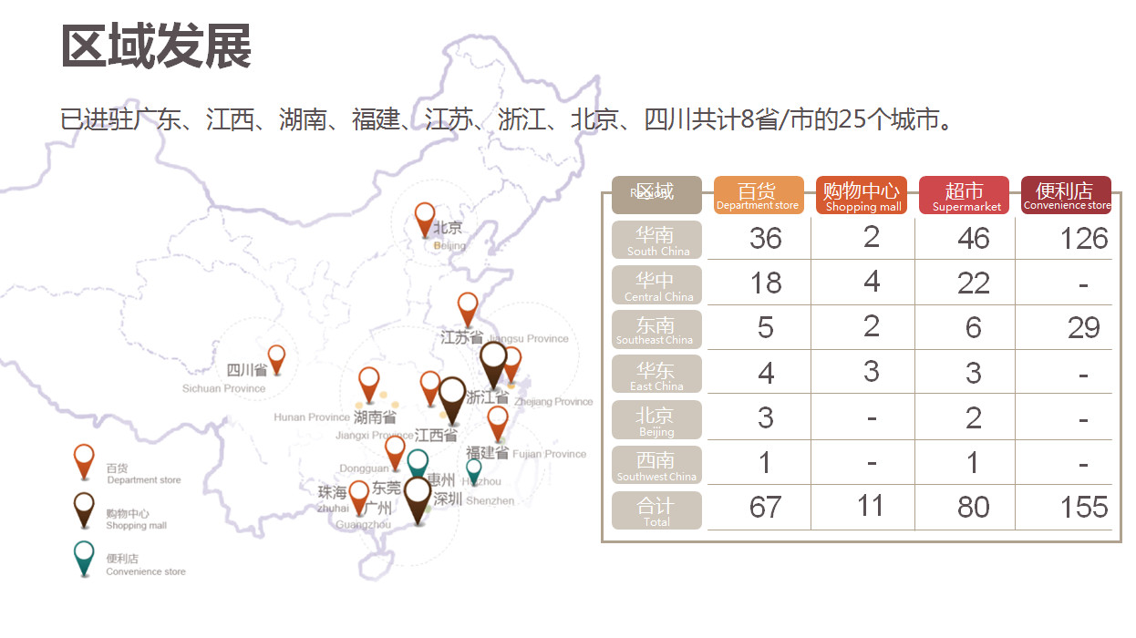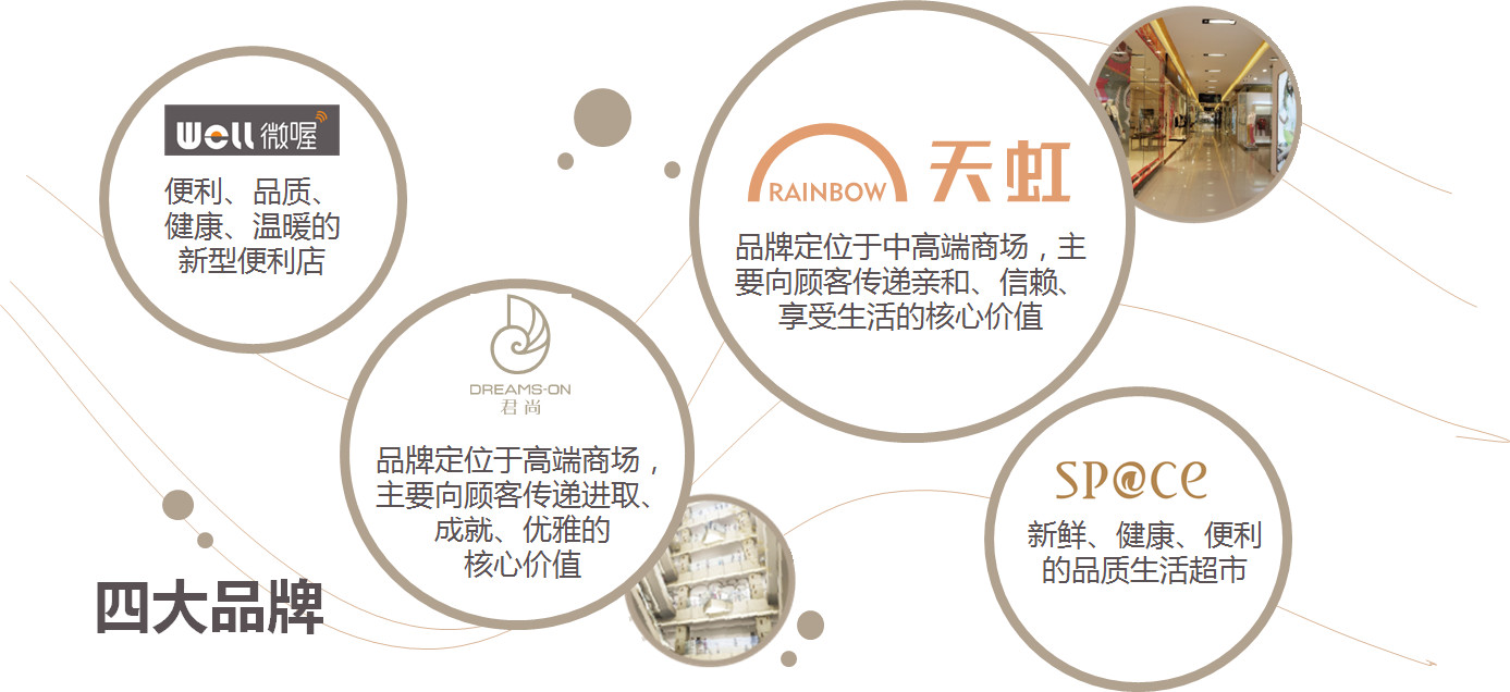 我們品牌有四個品牌,一個是天虹的便利店叫做微喔便利店,一個是天虹本身,面向中高端客戶,服務中產階級的家庭購物,我們有一個高端品牌叫君尚,比我們天虹本身更高的定位,還有一個超市,天虹在發展獨立超市的業態取的名字叫做space,我們天虹有八個省25個城市,天虹購物中心有四種業態。
