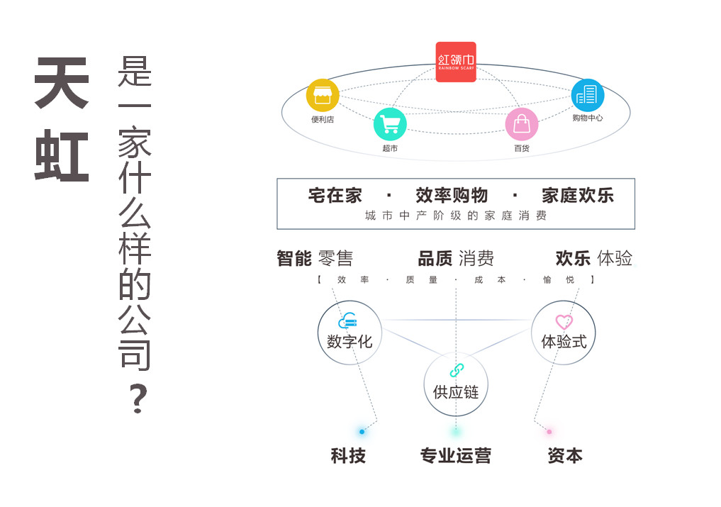 天虹到底是一家什么樣的公司,就是用這樣一張圖能夠展示出來天虹所有的業務邏輯,前面我們也講了,我們是用紅領巾統領我們所有實體店,形成一個完美的閉環,包括我們現在在會員管理、數字化營銷、精準引流都是基于紅巾數字化的線上平臺,打通了我們所有實體店的各個環節,形成了一個線上線下融合的新的形態。