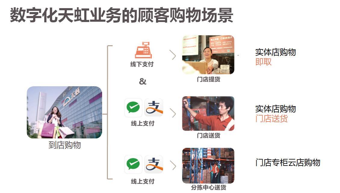 數字化就是說我們構建了新的購物場景,如果顧客到店里消費的話,我們可以由幾種支付方式,現在我們天虹96%到98%已經實現了專柜會員端直接收銀,超市也完成了自助收銀和手機收銀,顧客也可以到店馬上拿走,實體店也可以送貨,同時我們百貨商店的云店也可以為顧客提供服務。就是滿足顧客在不同的場景下的利用線上紅領巾的平臺實現顧客各種場景下的服務。