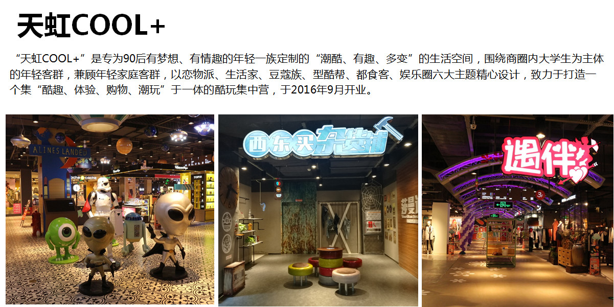 重點講一下這個案例,我們在南昌城市邊緣開了一家COOL+,這家店非常特殊,周圍沒有什么居民社區,有七所大學的市場,當時我們在天虹很少做這樣定位的市場,我們基本上圍繞社區或者城市中心店,三公里范圍內有幾十萬人的中產階級消費的家庭實體,這個店比較特殊,是一個大學生群體,基于這樣市場怎么做好精準定位,這個過程中即使是一個嘗試,也是在這個過程中讓我們看到了精準定位來實現百貨好的業績非常重要的關鍵,針對大學生的特點我們是為大學生特殊定制的一個商場,從設計的空間上,到品類的布局上,到提供的商品上,我們圍繞著大學生,包括我們把大學生分成一些生活派、戀物派,我們是基于這樣一些主題打造了不同的街區,吃喝玩樂購的街區,這個商場里面我們的零售比例比原來的百貨減少了,我們這個商場大概零售比例占了50%。更多做了一些體驗消費,我們考慮大學生其實是要喜歡聚、喜歡玩,同時我們在參與COOL+的名字也是大學生一起起的名字,我們選擇一個品類的時候,我們花了很多心思,比方我們選擇一家網吧,是篩選了200家網吧,找了四家有可能跟大學生匹配的網吧,由大學生一起參與,最后我們選定一家網吧,網吧有很多不是所有都是大學生喜歡的網吧,所以我們是這樣去打造這樣一個類別。
