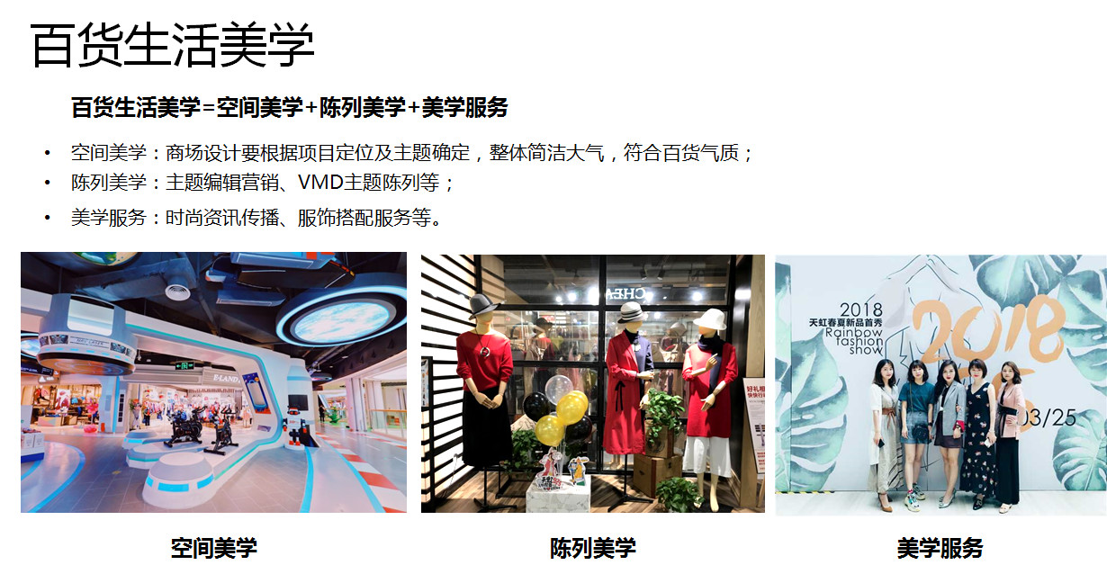 在生活美學,因為天虹百貨是我們主要的業態,我們在百貨上強調打造生活美學,包括三個方面,一個是空間美學,一個是陳列美學,一個是美學服務。在這個部分天虹大概已經花了兩三年的時間,我們也有我們專門的手冊和為消費者專門打造的一些沙龍服務,這個方面也為顧客不是搭配專業服務方面收到一個比較好的效果。