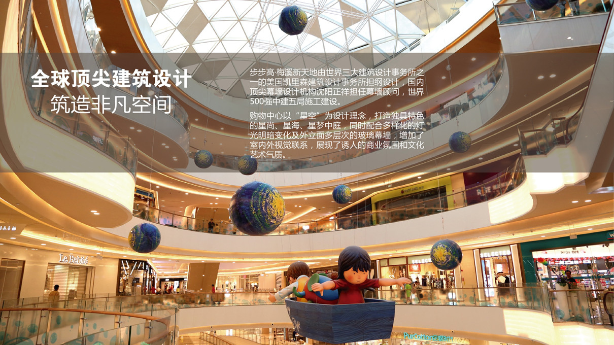 其中,購物中心以“星空”為設計理念,打造獨具物色的星尚、星海、星夢中庭,同時配合多樣化的燈光明暗變化及外立面多層次的玻璃幕墻,增加了室內外視覺聯系,展現了誘人的商業氛圍和文化藝術氣質。