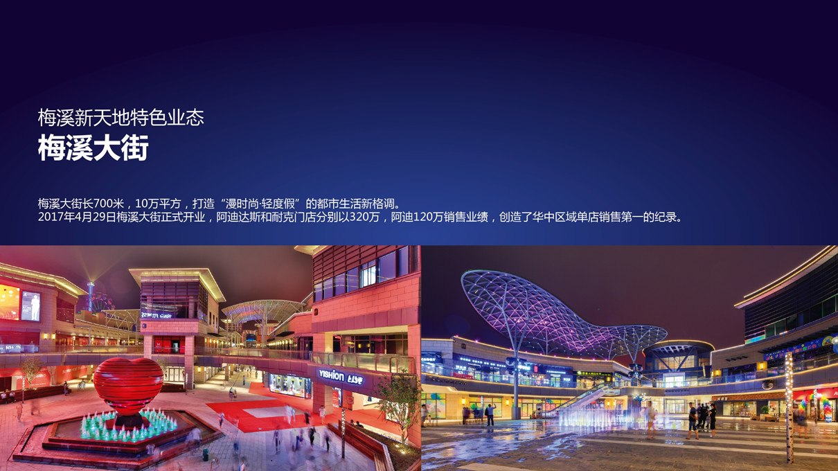 梅溪大街長700米,10萬平方,打造“漫時尚 輕度假”的都市生活新格調。2017年4月29正式開業,阿迪達斯、耐克門店分別以320萬、120萬的銷售業績,創造了華中區銷售第一的紀錄。