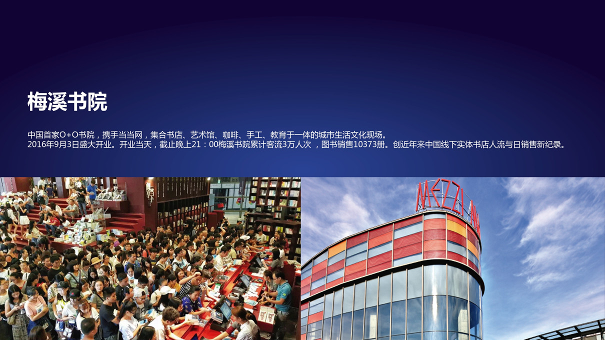 中國首家O+O書院,攜手當當網,集合書店、藝術館、咖啡、手工、教育于一體的城市生活文化現場。2016年9月3日盛大開業,當天圖書銷售10373冊,創近年中國線下實體書店日銷售紀錄。