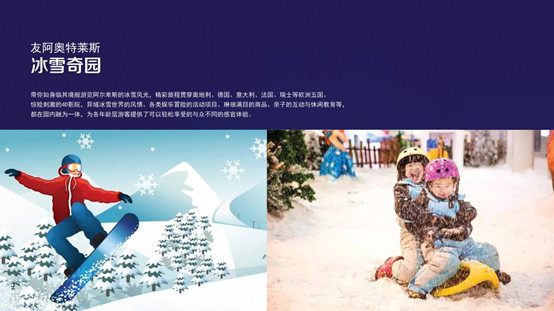 冰雪奇園帶你如身臨其境般游覽阿爾卑斯的冰雪風光,精彩旅程貫穿奧地利、德國、意大利、法國、瑞士等歐洲五國。驚險刺激的4D影院,異域冰雪世界的風情、各類娛樂冒險的活動項目、琳瑯滿目的商品、親子的互動與休閑教育等, 都在園內融為一體,為各年齡層游客提供了可以輕松享受的與眾不同的感官體驗。