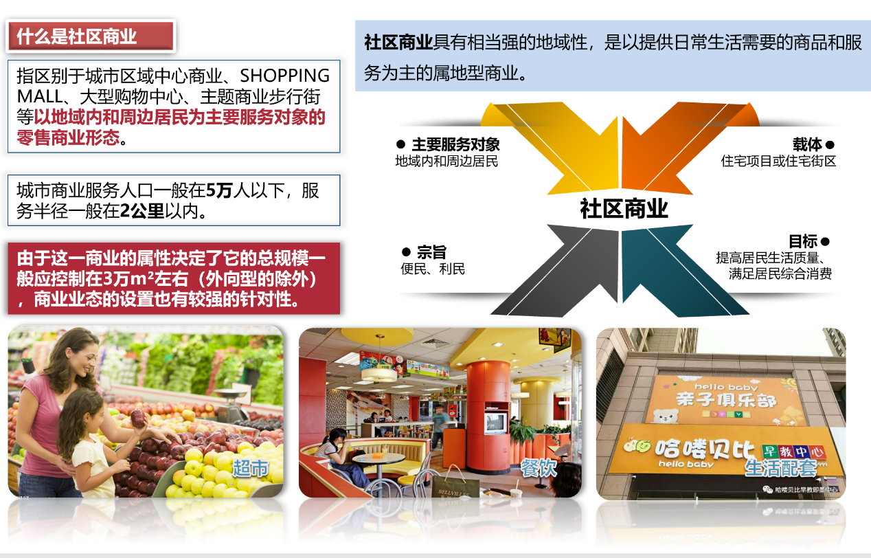 除了利用拉伸和收縮原則影響導流端和經營端之外,提升社區家庭、親子客“頻次”還有如下主要模式:結合周邊社區情況精準定位;業態組合方面提升便利性;經營端提升性價比與情感聯系。定位方面,社區商業通常以家庭客和親子客為主力,根據周邊社區情況不同也會有差異;業態組合方面,社區商業需更多的導入生鮮加強型超市和餐飲作為主力業態組合,增強賣場整體便利性;經營端方面,社區商業則需要通過抓商品提升社區人群購買力,通過服務和環境強化情感聯系。