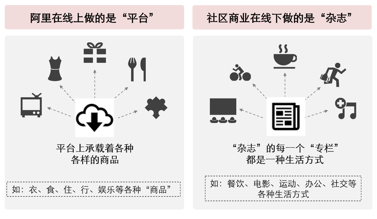 眾所周知,阿里在線上做的是“平臺”,平臺上承載著各種各樣的商品,如:衣、食、住、行、娛樂等各種“商品”。而社區商業在線下可以比喻為做“生活雜志”。“雜志”的每一個“專欄”都是一種生活方式,如:餐飲、電影、運動、辦公、社交等。與一般的商圈型賣場不同,社區商業的“生活雜志”對客流的吸引力來自于賣場達人對于商品的“內容編輯”所形成的“生活提案”。