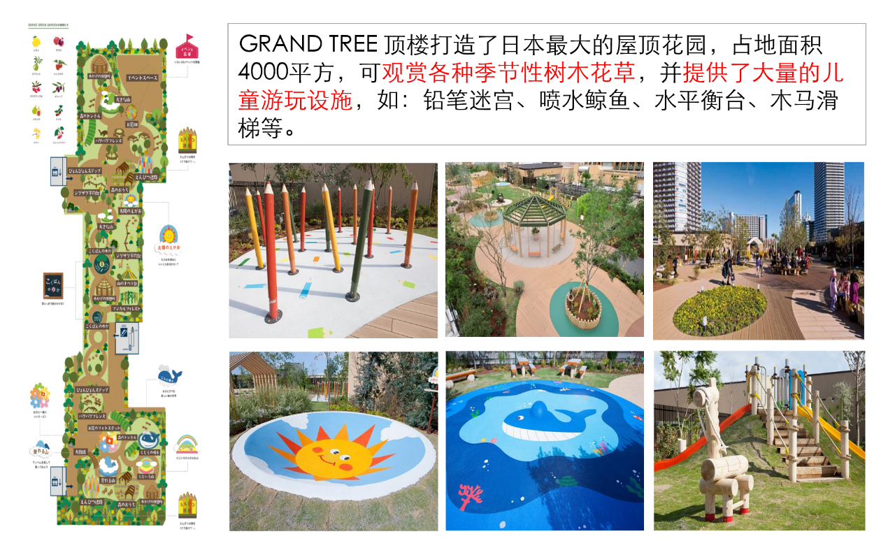 以東京格林目為例:格林木武藏小杉是集百貨、超市、零售、餐飲、休閑娛樂為一體的創新社區型購物中心,意在打造一個讓顧客生活更加豐富多彩、更加幸福的場所,把購物中心的主要功能從傳統的“購物休閑”顛倒過來,轉變為“休閑購物”。