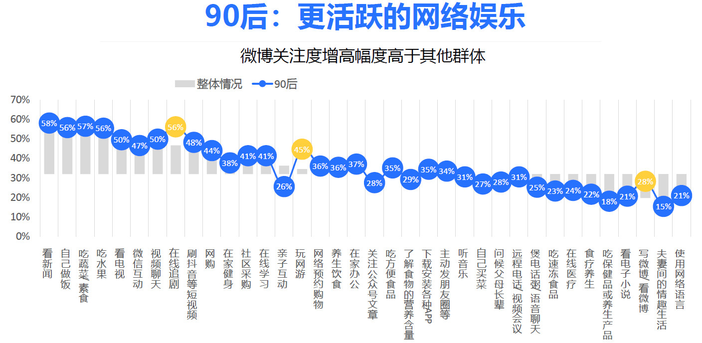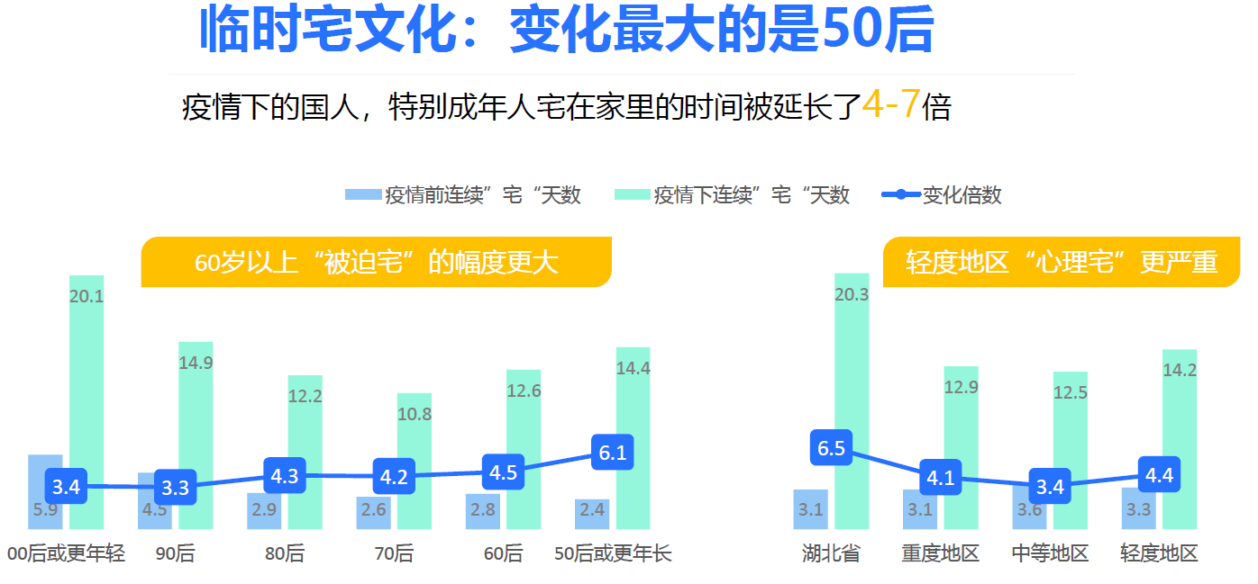 臨時(shí)宅文化之下變化最大的當(dāng)屬50后,不僅養(yǎng)成使用網(wǎng)絡(luò)的習(xí)慣,在家健身這一習(xí)慣養(yǎng)成率也高于其他群體。 00后偏向更活躍的網(wǎng)絡(luò)行為,90后偏向網(wǎng)絡(luò)娛樂(lè)、80后更多的是親情和情趣,70后更多的特征表現(xiàn)為微信互動(dòng)。