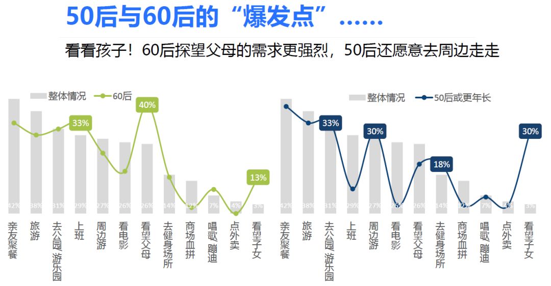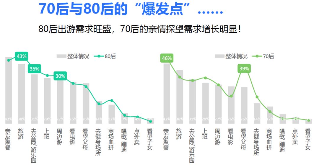 80后對(duì)離開(kāi)家去旅行的需求旺盛;50后表現(xiàn)為周邊游機(jī)會(huì)點(diǎn)