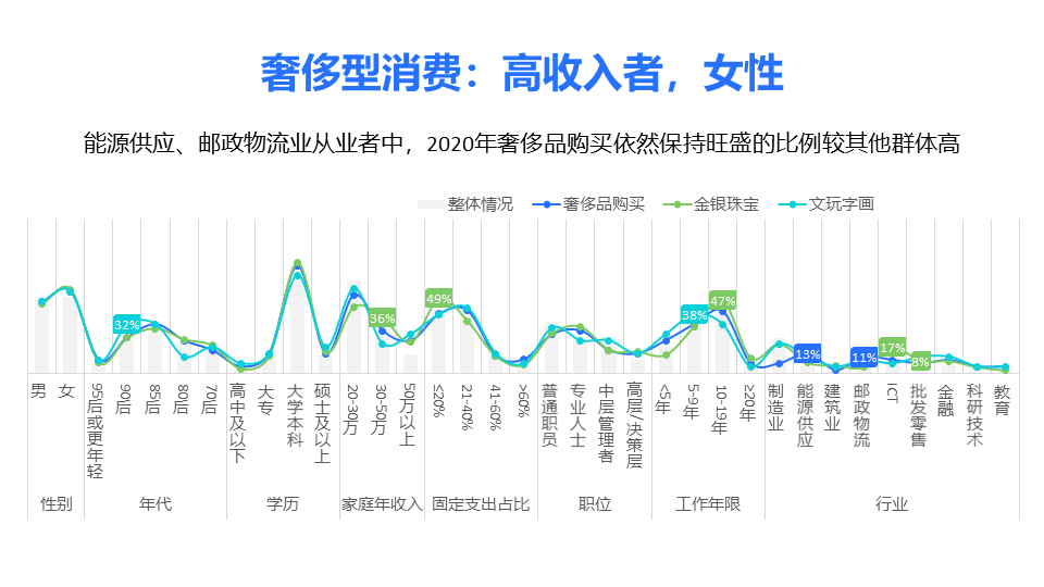 ▍奢侈型消費:以高收入者、女性為主。能源供應、郵政物流業從業人員未來一年對奢侈品購買的消費欲望依然高于其他群體。
