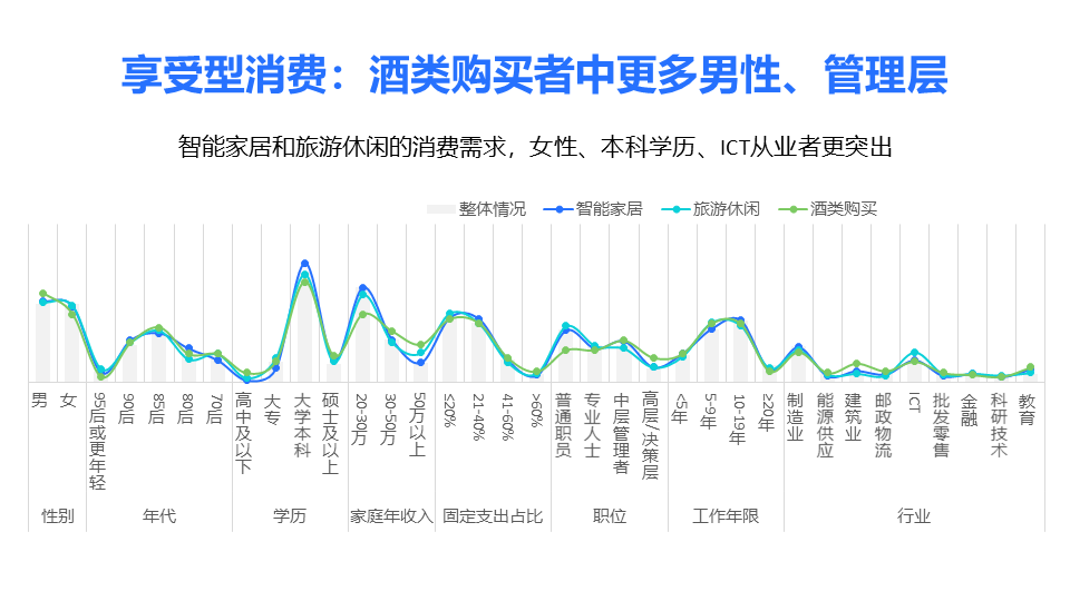 ▍享受型消費:主要集中在智能家居和旅游休閑,此外,以男性管理層為主要消費群體的酒類購買需求也尤為突出。