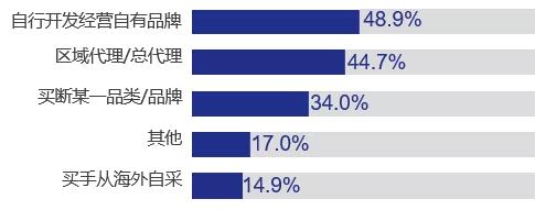 在經(jīng)營自采自營的企業(yè)當(dāng)中,48.9%的企業(yè)選擇自行開發(fā)經(jīng)營自有品牌;44.7%采取區(qū)域代理或總代理的方式; 34.0%以買斷某一品類或品牌的形式營運