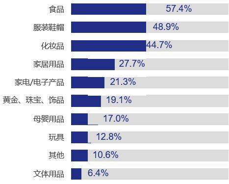 商品品類方面,57.4%的企業(yè)選擇食品作自采自營,其次為服裝鞋帽 (48.9%) 及化妝品