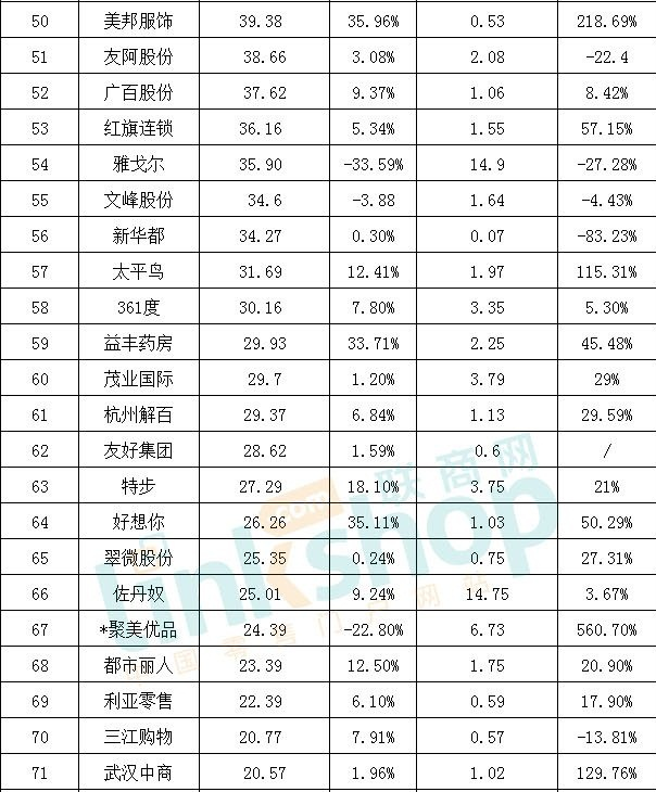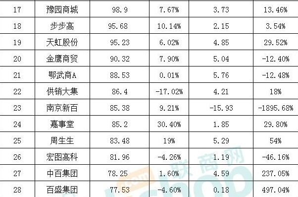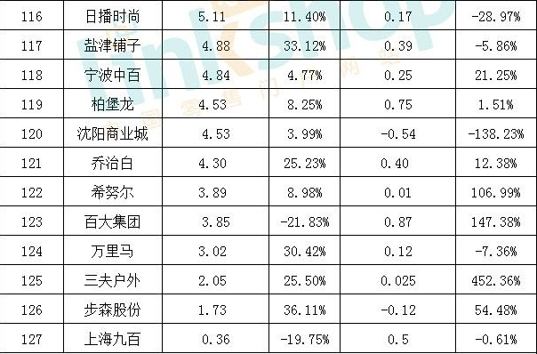 (4)有些公司是賬面雖然是盈利的,但自營業務虧損,靠投資收益與租金收入實現凈利潤。如排在127家零售上市公司營收排行榜最后一位的“上海九百”就是典型例子。2018年上半年“上海九百”的凈利潤大于營收,營收3590萬元,凈利潤4971萬元。