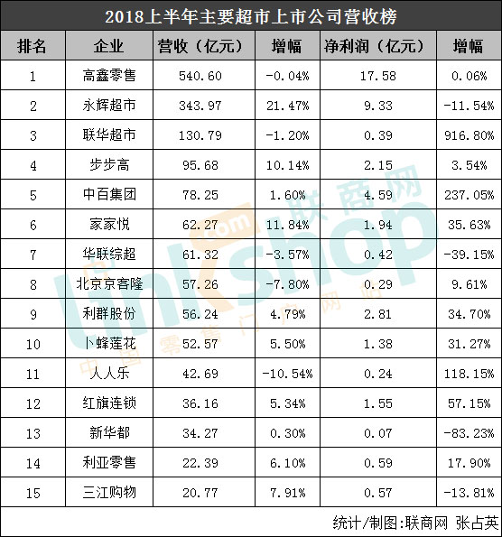 (3)聯華超市連續虧損后終于實現了盈利。從2015年到2017年,聯華超市連續虧損,累計虧損額已逾12億元,但今年上半年終于實現了3900多萬元的凈利潤。中報稱成功扭虧為盈主要原因是:聚焦新零售探索,提升在線銷售能力,增加同店銷售規模;積極打造差異化供應鏈,加強與供貨商的談判能力,提升服務收入;優化生鮮源頭采購網絡,發展生鮮自營基地,為門店鮮食品類擴大提供有力支撐;進一步優化網點,落實降本增效,成本費用控制卓見成效。