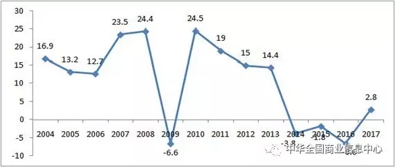 圖表 1 2004-2017年春節黃金周全國百家重點大型零售額同比增速(%)