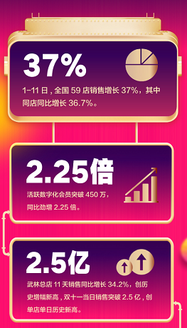 其中,1-11日,全國59家店銷售增長37%,同店同比增長36.7%;活躍數字化會員突破450萬,同比勁增2.25倍;杭州武林總店、杭州西湖店、溫州世貿店等13家門店雙11當日銷售創歷史新高。