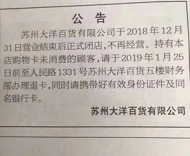 11月28日,蘇州大洋百貨有限公司發(fā)布公告稱2018年12月31日營業(yè)結(jié)束后,正式閉店,不再經(jīng)營。持有本店購物卡未消費的顧客,可以在2019年1月25日前至人民路1331號蘇州大洋百貨五樓財務(wù)部辦理退卡,同時請攜帶好有效身份證件及同名銀行卡。