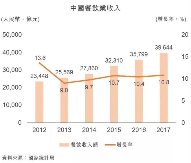 國(guó)家統(tǒng)計(jì)局的數(shù)據(jù)顯示,中國(guó)餐飲收入由2012年的23,448億元(人民幣,下同)上升至2017年的39,644億元,按年增加11.1%。