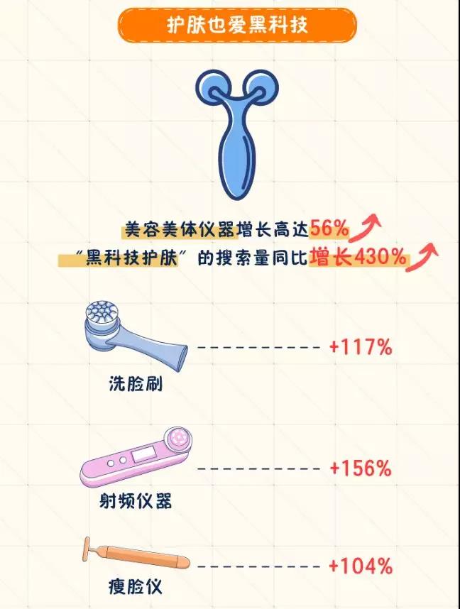 白皮書顯示,今年美容體儀器的增長(zhǎng)高達(dá)56%,其中洗臉?biāo)⒃鲩L(zhǎng)117%,射頻儀器增長(zhǎng)156%,瘦臉儀增長(zhǎng)104%,這些產(chǎn)品都自帶科技屬性。