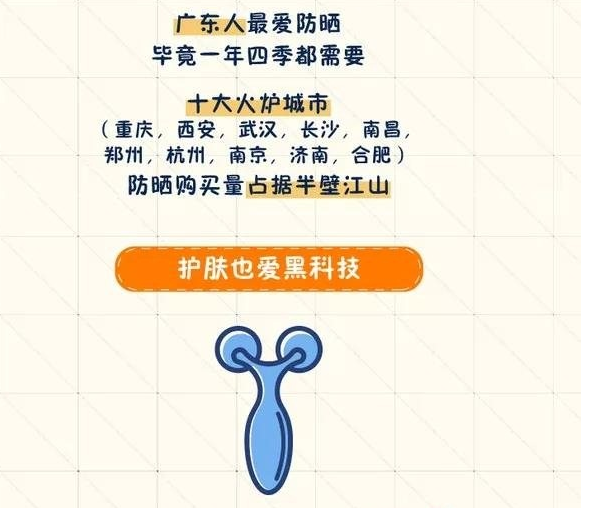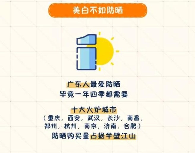 還有,美白不如防曬。白皮書顯示,廣東人最愛防曬,畢竟因?yàn)闅夂蛟颍瑥V東人一年四季“不可一日無此君”;同理,十大火爐城市(重慶、西安、武漢、長(zhǎng)沙、南昌、鄭州、杭州、南京、濟(jì)南、合肥)也理所當(dāng)然地占據(jù)了防曬購(gòu)買量的半壁江山。