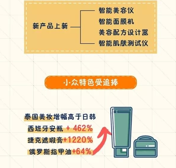 首先,有特色的小眾品牌具備了明星潛質(zhì)。比如說,一提到美妝品牌,我們第一個(gè)想到的是美日韓等國(guó)的知名品牌,但白皮書顯示,西班牙的安瓶增長(zhǎng)高達(dá) 462%、捷克的遮瑕膏增長(zhǎng)1220%、俄羅斯的指甲油增長(zhǎng)達(dá)64。小眾品牌“逆襲”起來原來這么恐怖?