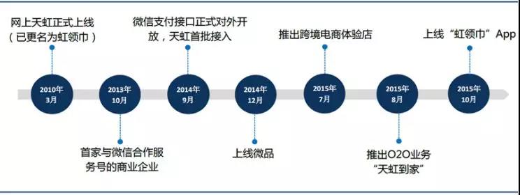 天虹2010年3月就推出網上天虹發展電商,2013年起明確全渠道的發展戰略,發展至目前已形成“虹領巾+微信+微品”三位一體的線上入口,結合“天虹到家+跨境電商體驗店+自提點”實現門店電商化。