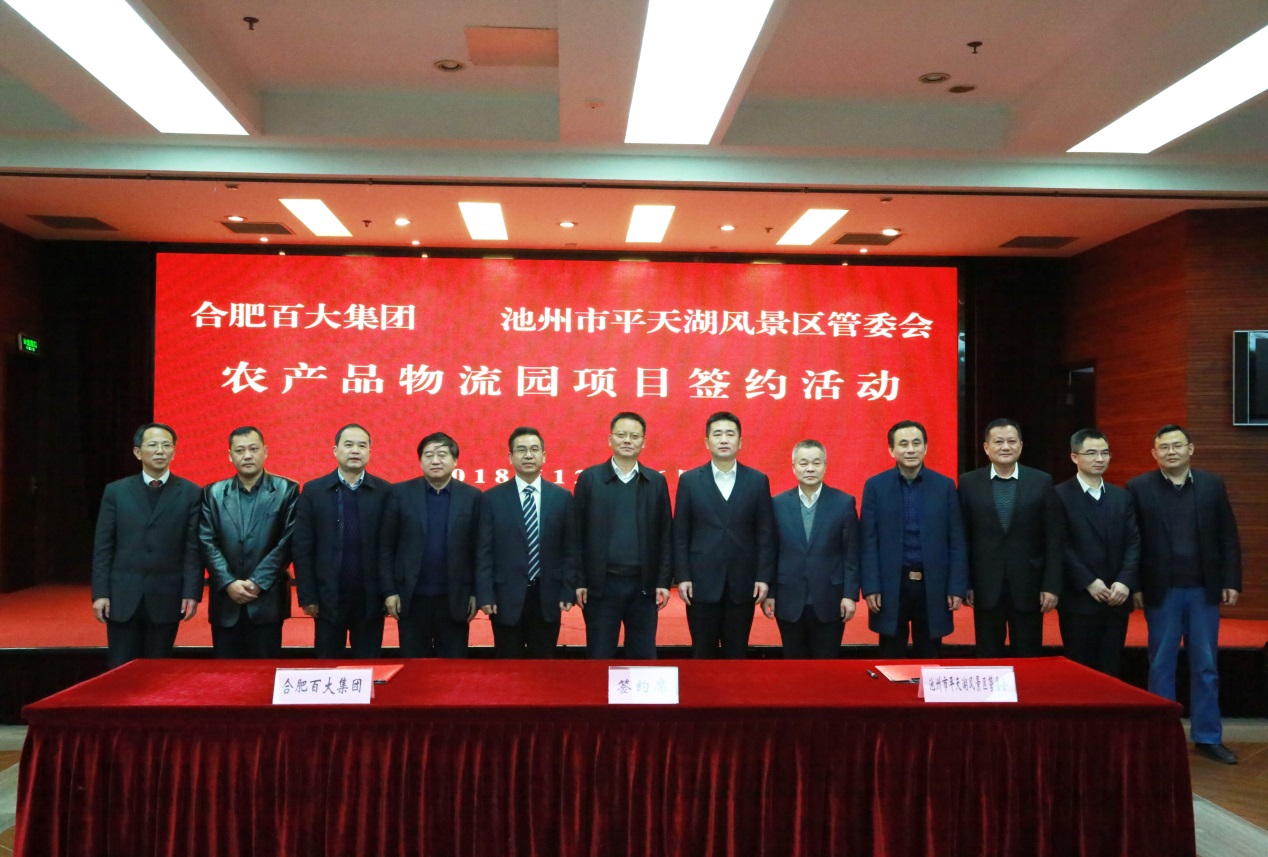 近日,合肥百大集團黨委書記、董事長劉浩率隊參加池州百大農產品物流園項目簽約儀式。池州市委副書記、市長雍成瀚、副市長劉會秋、市政府秘書長吳慶華、副秘書長王正武、平天湖管委會主任徐友華等出席簽約儀式并見證項目簽約。