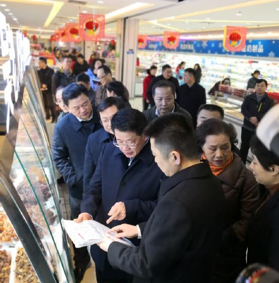 春節前,由安徽省副省長楊光榮、省政府副秘書長章石生、省市場監管局局長韓永生、合肥市副市長朱策等省市相關部門領導組成的檢查組一行蒞臨百大集團合家福馬鞍山路購物廣場檢查節日市場監管工作。百大集團黨委書記、董事長劉浩,副總經理余綯等陪同視察。