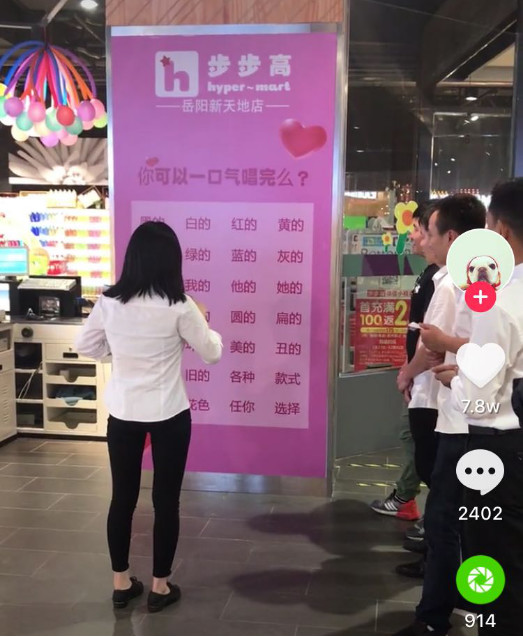 最火一條原創視頻當天即收獲了616萬閱讀量和7.8萬點贊量,視頻中一名女員工站在岳陽市步步高“新天地店”內的互動海報前,練習唱著海報上《氣球》的歌詞,這一挑戰肺活量的互動引起了眾多網友的興趣,迅猛增長的播放數據使王閃在抖音上開始小有名氣,也讓步步高岳陽“新天地店”陸續展現在更多人眼前。