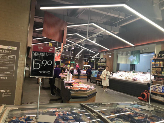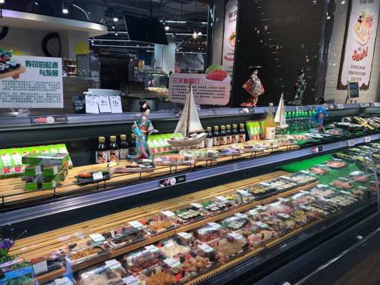 二是位于拐角處的賣肉處,原本有一面墻可以打通,但門店并沒有這么做,他留下了這一拐角,將肉陳列于兩側,員工在內服務,特意營造出一種“集市”的氛圍。這是借鑒泰國一家優秀零售商的做法,事實證明,這種陳列形式也深受消費者喜愛。