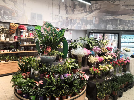 一是入口左手處的鮮花區域,區別于平常超市內角落堆頭的形式,在其左側做了一面隔斷墻,打造出一種鮮花專業店的感覺。
