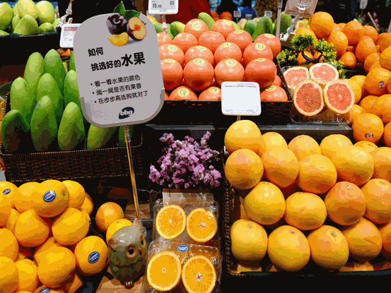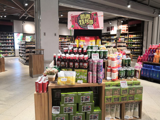 店內很多主題關聯性陳列的堆頭,比如在橙子堆頭上放置幾瓶不同品牌的橙汁;椰子貨架下選取椰子汁進行搭配;“鮮食演義”中的雜糧包裝食品上放以原生食材;紅酒堆頭旁陳列著少量巧克力等;在燒烤主題旁放置木炭、紙杯、啤酒等相關性商品,便于顧客一站式購齊。