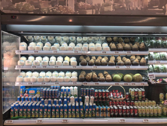 王閃與團隊在陳列上也會有奇思異想,很少有門店給小眾水果椰子很大的排面,砂之船店卻專門騰出兩列風幕柜貨架擺放椰子與其關聯品,這其中有他自己的邏輯。“我們在陳列時會選擇一些小眾商品將其放大,這些小眾商品年輕人會很喜歡。”