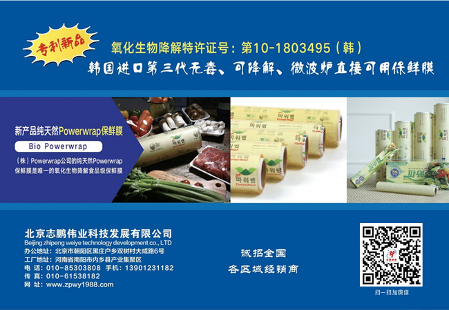 韓國進口專利保鮮膜——“純天然Powerwrap保鮮膜”是志鵬科技在本次特許加盟上展重點向觀眾和經銷商們展示的一款產品。其特點有三:其一,這種保鮮膜采用對人體無害無毒的純植物性材料制成,不含有DEHA塑化劑,使用起來安全可靠;其二,保鮮膜使用的Bio-Mass原料,在使用后廢棄時可以在自然環境下自行生物降解,降低了對生態環境破壞的同時,還起到節約能源、減少碳排放的作用;其三,產品可在40℃-120℃的微波爐上使用,不會融化、變形、產生有毒物質。這種保鮮膜可廣泛應用于包裝食品、水果、蔬菜等,小至個人家庭大至商超工廠,都可以放心使用。