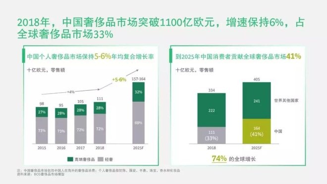 BCG預測,到2025年,中國個人奢侈品消費將保持5-6%的復合增長率,到2025年突破1600億歐元,貢獻全球41%的奢侈品市場。