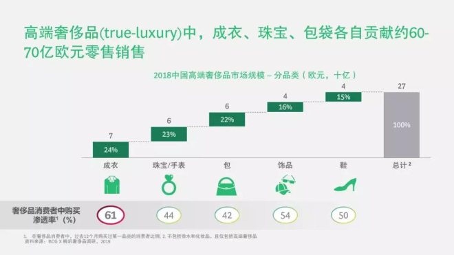在高端奢侈品(true-luxury)【1】中,成衣、珠寶、包袋是銷售額最高的三大品類,各自約貢獻60-70億歐元的零售銷售。從滲透率看,過去12個月購買過奢侈品成衣的消費者占比高達61%,領先其他所有品類。