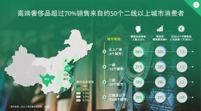 從地域上看,大城市依舊是奢侈品消費的大本營,70%的銷售來自50個二線以上的城市消費者,其中北上廣深四個城市占比26%。三線以下城市雖然也貢獻了35%,但消費高度分散在超過2000個城市。